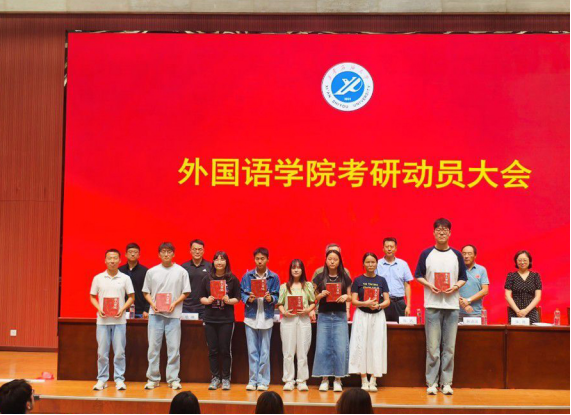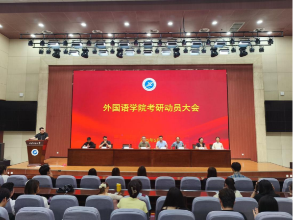 在图书馆弘石报告厅召开2025年考研动员大会。学院党政领导、英语系主任、翻译系主任、俄语系主任、辅导员,以及大二、大三全体学生齐聚一堂,共同开启这场充满希望与力量的动员之旅。