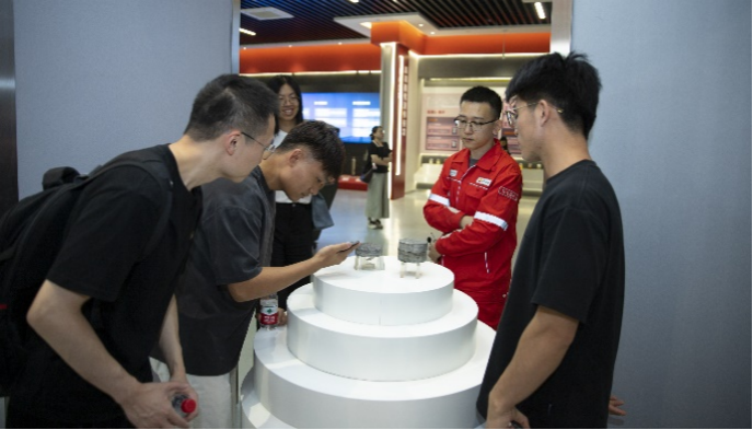 抵达公司后,同学们在公司工作人员的引导下有序进入基地进行参观。公司安排了经验丰富的讲解员,通过播放精心制作的视频、展示详细的图片,向同学们全面介绍公司的发展历程。从公司的创立之初到如今在国内外市场取得的显著成就,同学们深刻感受到了公司的深厚底蕴和蓬勃发展的活力。讲解员还着重介绍了公司的业务范围,涵盖了钻井、完井、压裂等多个领域,以及公司在技术创新方面取得的一系列成果,如新型钻井液的研发、先进压裂技术的应用等。此外,讲解员还讲述了石油先辈的故事,他们奉献青春的事迹令同学们触动。同学们专注地聆听着,对石油行业有了更直观、更深刻的认识。