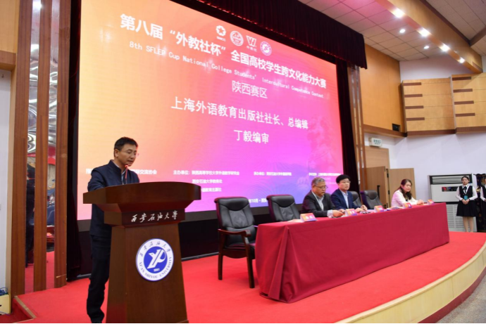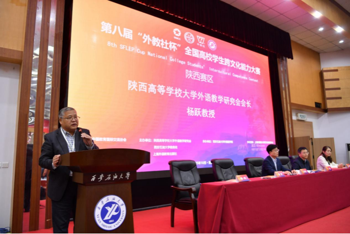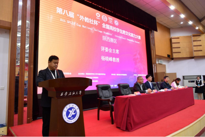 培养复合型人才的重要目标之一。随后,上海外语教育出版社社长丁毅在致辞中指出,外教社长期专注于构建高水平的跨文化教学与实践平台,鼓励参赛选手通过比赛提升专业能力、拓展国际视野,并以良好的文化敏感度理解多元世界。陕西高等学校大学外语教学研究会会长杨跃教授肯定了大赛对外语教育改革和创新人才培养的推动作用,期待选手们通过增强跨文化沟通能力、加深对文化差异的认知,实现综合素质的全面提升,展现优异表现。评委组组长西北农林科技大学语言文化学院院长杨晓峰教授介绍了本次比赛的评委,并预祝各参赛队伍赛出风格、赛出水平。