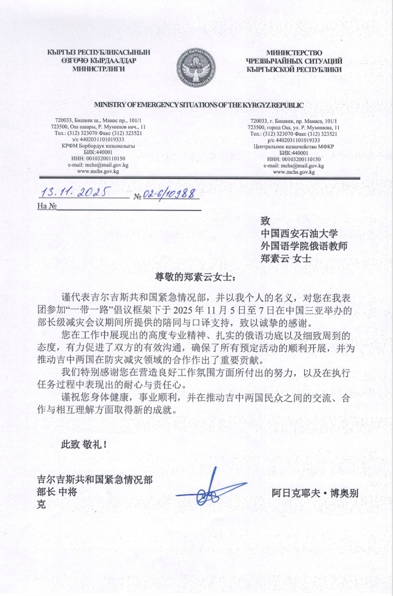 我院俄语教师郑素云应会议主办方邀请,为吉尔吉斯共和国应急管理部部长提供翻译服务,负责配合部长代表团在华期间的接待工作。工作期间,郑素云老师以扎实的专业能力、出色的俄语水平和认真细致的工作态度,圆满完成了各项任务,展现出我院外语教师优秀的国际服务素养。吉尔吉斯共和国应急管理部部长及其代表团对其工作给予高度认可,并在返程后专门致信表示感谢。